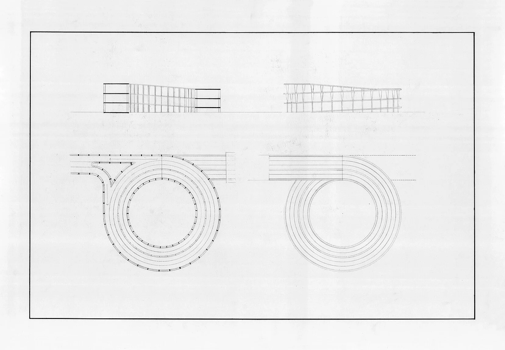 The parking is planned in an almost mechanical fashion. Depending on the possibilities for a foundation on the ground, there is a column for every four or fifth parking spot. The columns are made as thin as possible to save space for the parking spots. The elevator takes the form of a square that is rotated 45 degrees, while the staircase takes the form of a cylinder. Design is absent. These forms are the most efficient and optimized forms taking into consideration the task they have to solve. Once established, this system of columns and cores is duplicated throughout the one-kilometer-long Parking Structure. The road on top of the structure ends in a viaduct that spirals down to the main highway, going into a tunnel underground. In the middle of the spiraling viaduct, there is a forest. The forest represents the opposite. The city's central parking facility allows the rest of the city to be bathed in lush vegetation.