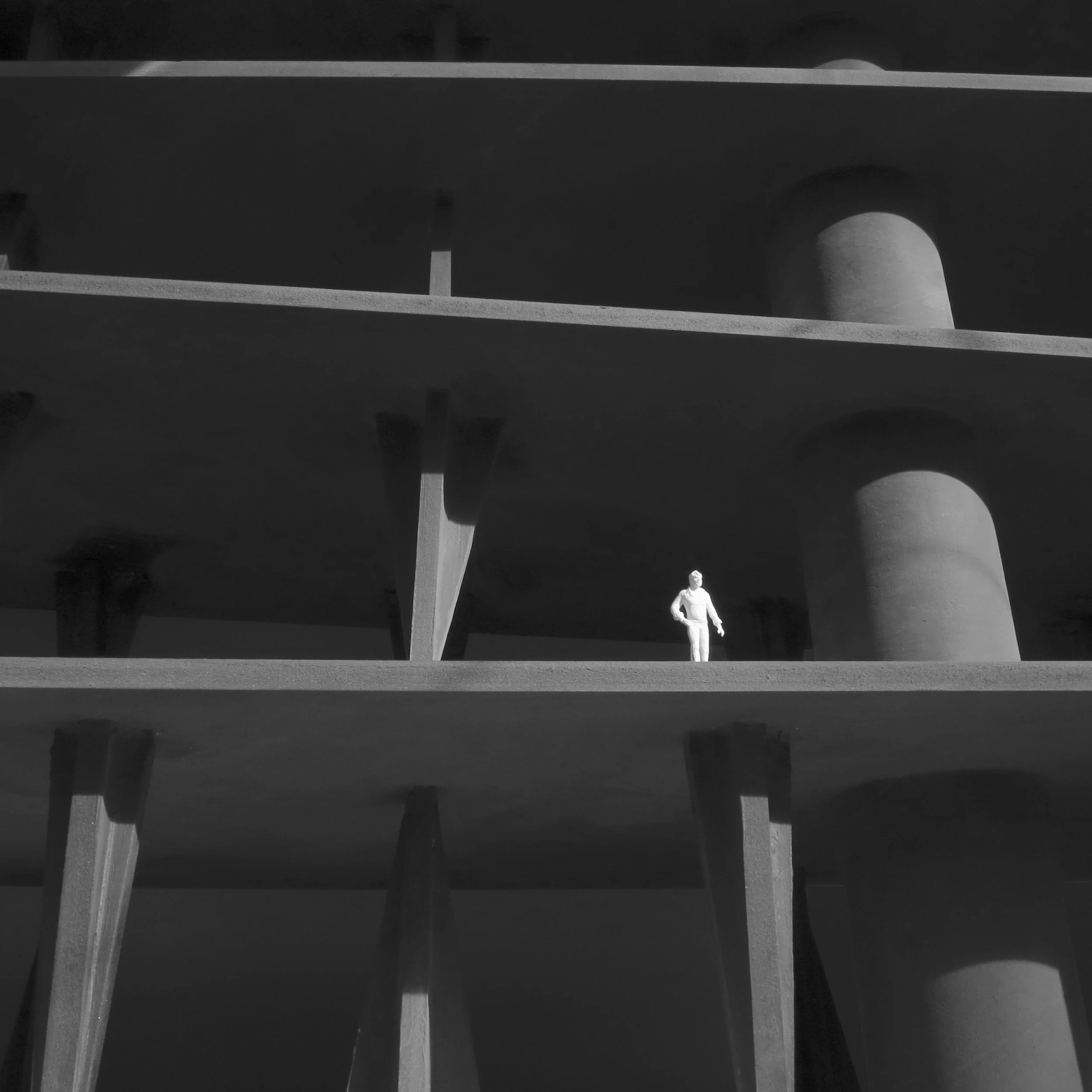 Conceptual model / Scale: 1:100 / Wood painted in graphite grey. The idea of the model is that the circulation cores are hidden within the “columns”, and were the spatial experience has the archaic feeling of moving between solids without any other visual disturbances. The black/grey graphite color also dims down the daylight, making the spatial experience as calm as possible.